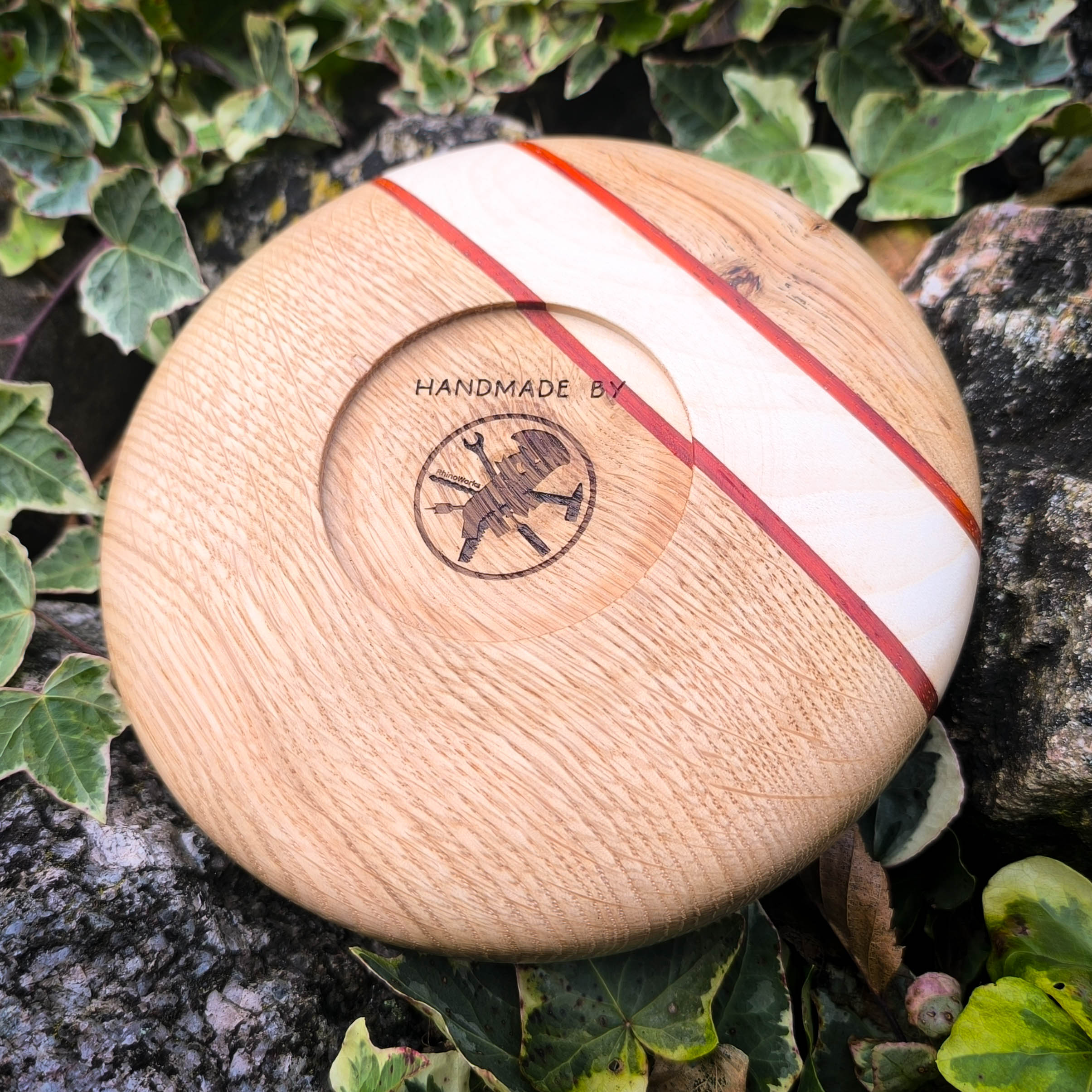 Diese flache Schale wurde aus bestem Schweizer Eichen- und Ahornholz gedrechselt. Für das exotische Detail sorgen die beiden Streifen Padoukholz. Ein absolutes Unikat und mit viel Liebe und Geduld gedrechselt. Lebensmittelecht geölt.